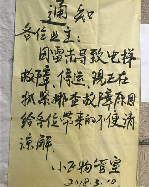 住戶們透露,3月10日下午,空中突然響了一聲驚雷,聲音比較大。而就是這一聲驚雷導(dǎo)致小區(qū)的三部電梯發(fā)生故障停運(yùn)。事發(fā)后,小區(qū)的物業(yè)也積極進(jìn)行搶修。 小區(qū)的工作人員透露,小區(qū)的電梯電路主板比較特殊,很多地方都買不到,最終他們多方聯(lián)系,在外地買到了一塊主板,目前已經(jīng)運(yùn)回來(lái)了,打算先讓一部電梯恢復(fù)運(yùn)行。
