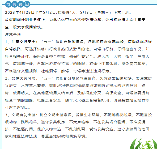 寧雷檢測五一放假通知